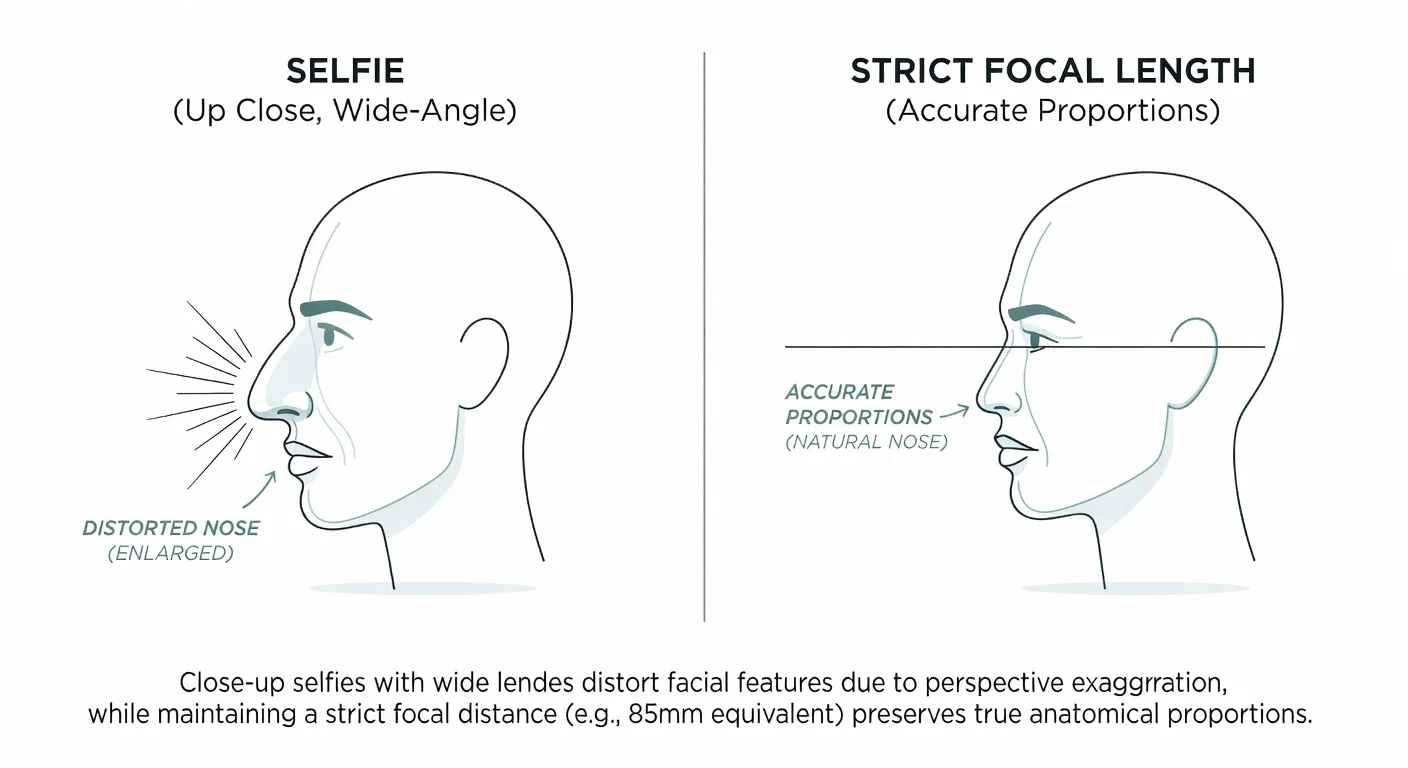Camera lens distortion often skews these results. A wide-angle selfie camera (24mm equivalent) makes your nose look 30% wider than it actually is.