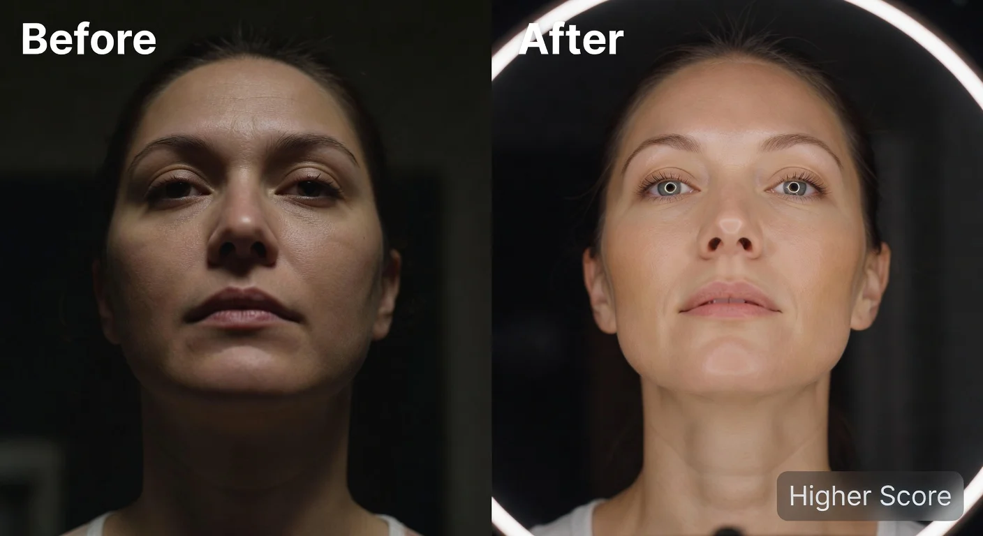 - Eyebrows: Low-contrast eyebrows lower your score. Darkening them slightly increases facial definition.