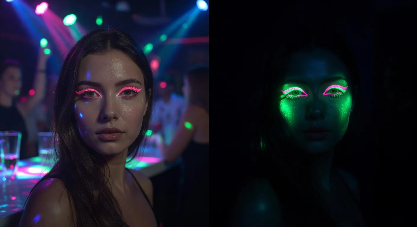 Glow party makeup ideas revolve around UV-reactive cosmetics designed to fluoresce under blacklights. Unlike everyday makeup, these products rely on vivid neon pigments and water-activated bases to create high-contrast shapes in totally dark environments.